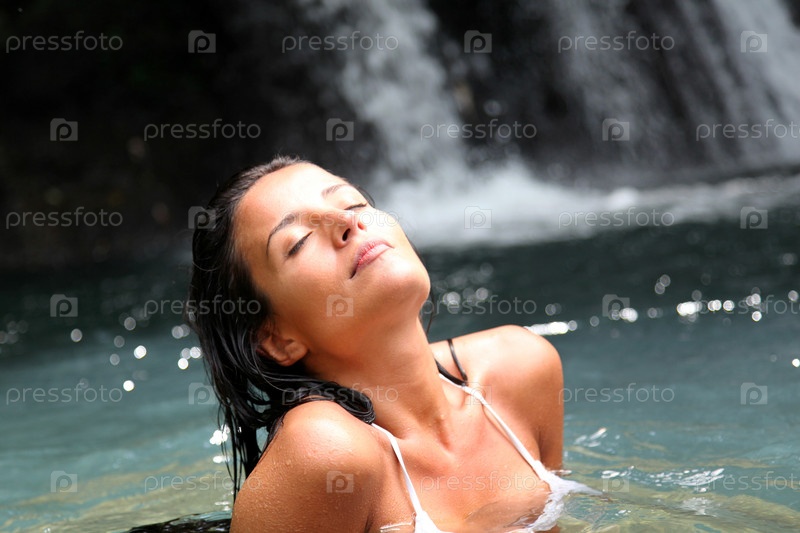 Красивая женщина, купается рядом с природным водопадом
