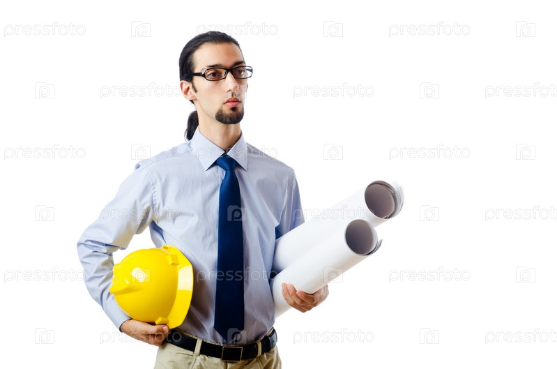 Архитектор с чертежами и каской на белом