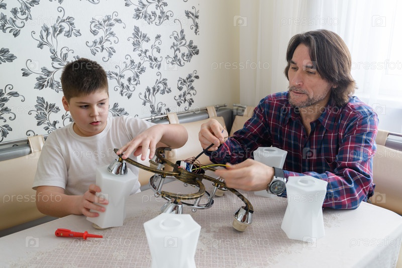 Отец с сыном ремонтируют люстру