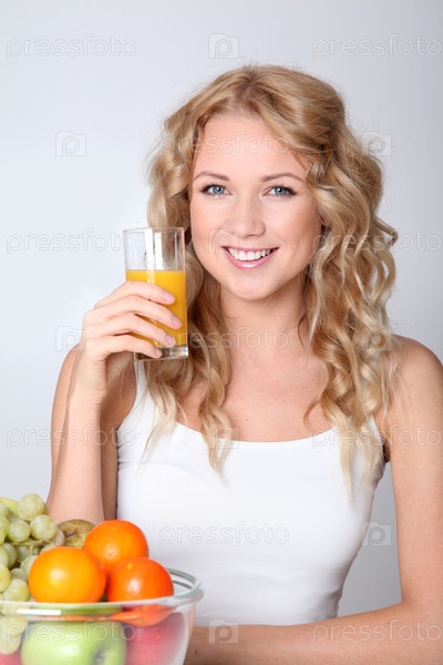 Красивая блондинка пьет сок