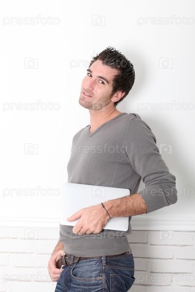 Человек, опирается на стену с планшетным компьютером