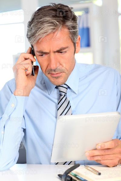 Менеджер в офис разговаривает по мобильному телефону