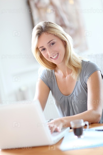 Женщина работает на дому на портативном компьютере