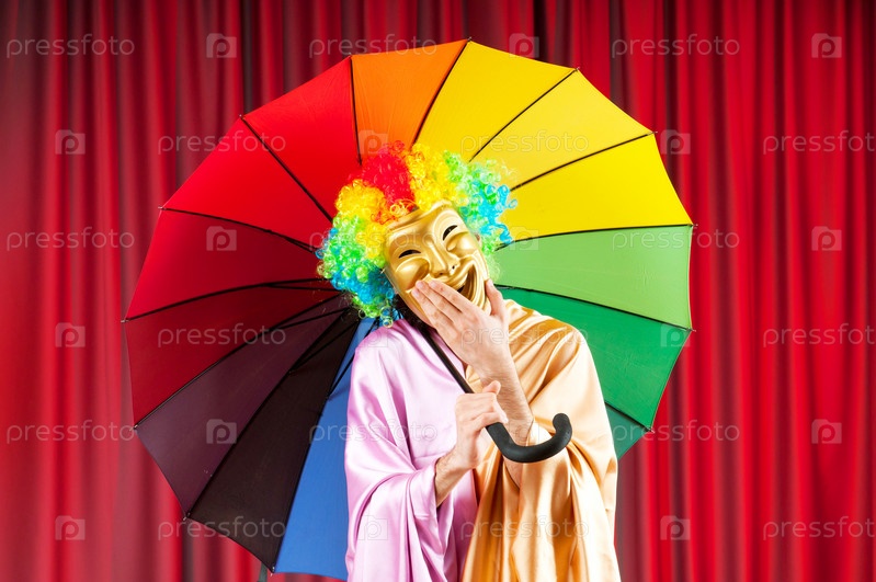 Актер в веселой маске с зонтом