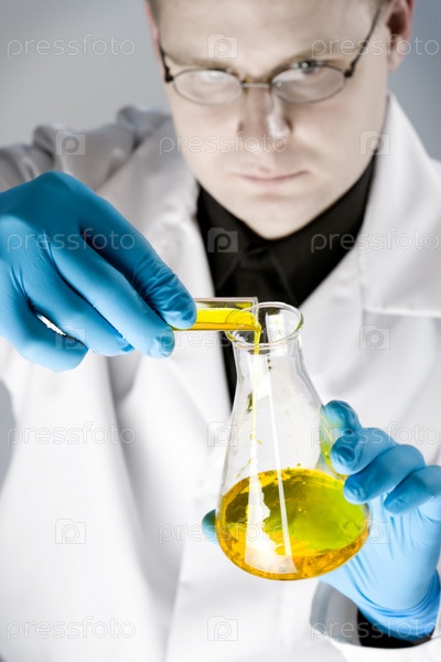 Химик, сосредоточенный на колбе