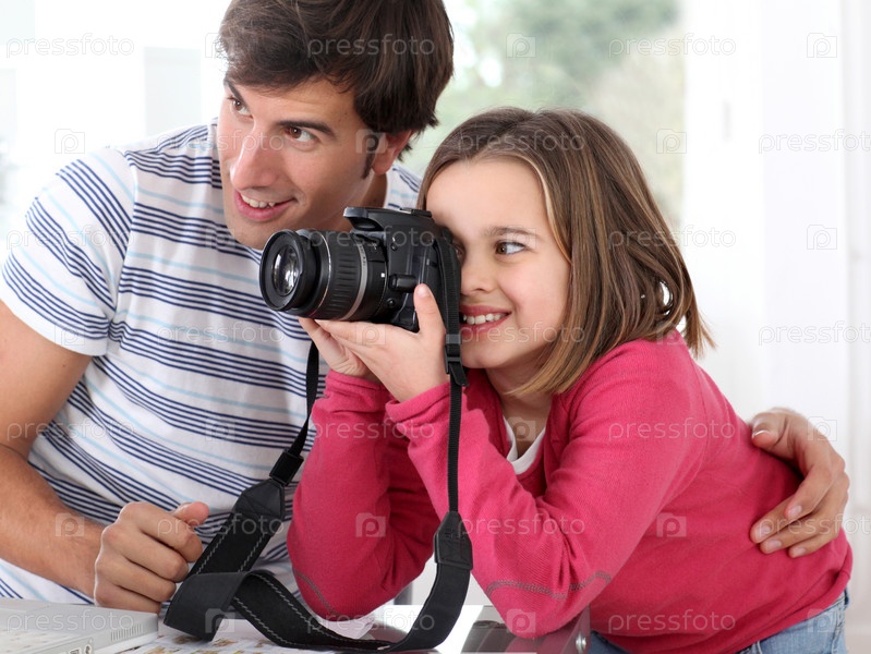 Отец учит дочь фотографировать
