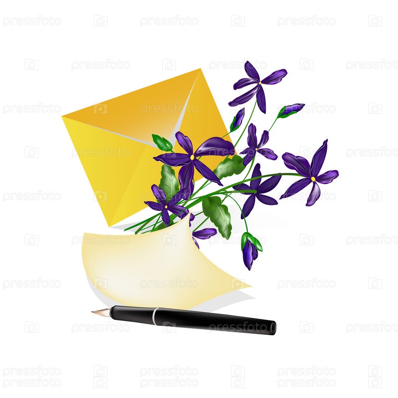 Желтый конверт, чистый лист бумаги, ручка и букетик нежных цветов. Изолированные на белом фоне
