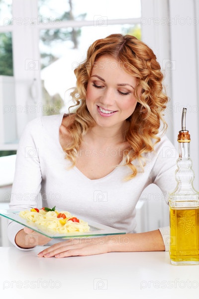 Женщина, держащая тарелку макарон