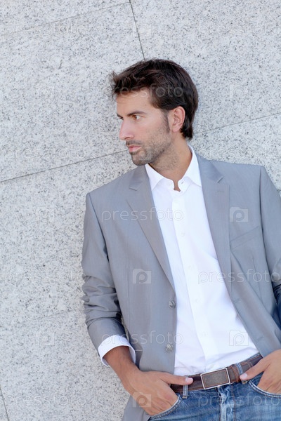 Мужчина опирается на серую стену