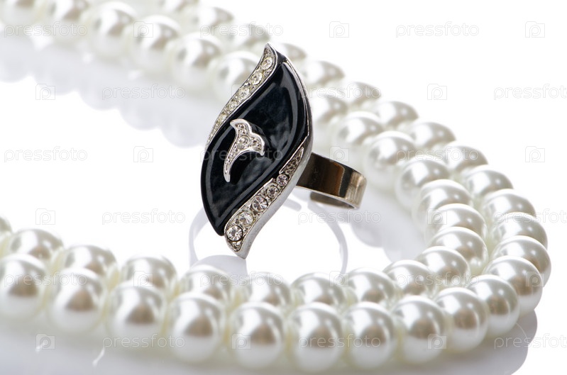 Кольцо и нить жемчуга на белом фоне
