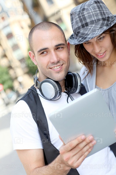 Молодая пара использует планшет в городе