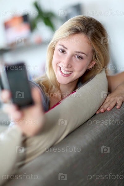 Женщина показывает смартфон