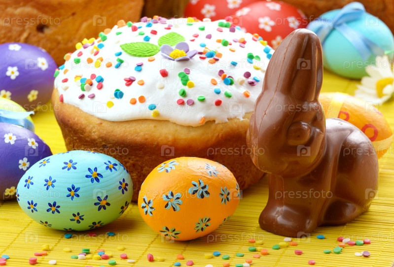 Пасхальные яйца, кулич и кролик