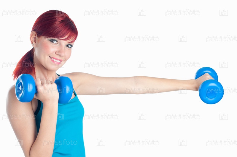 Улыбающаяся рыжеволосая девушка, тренирующаяся с гантелями. Изолированная на белом фоне