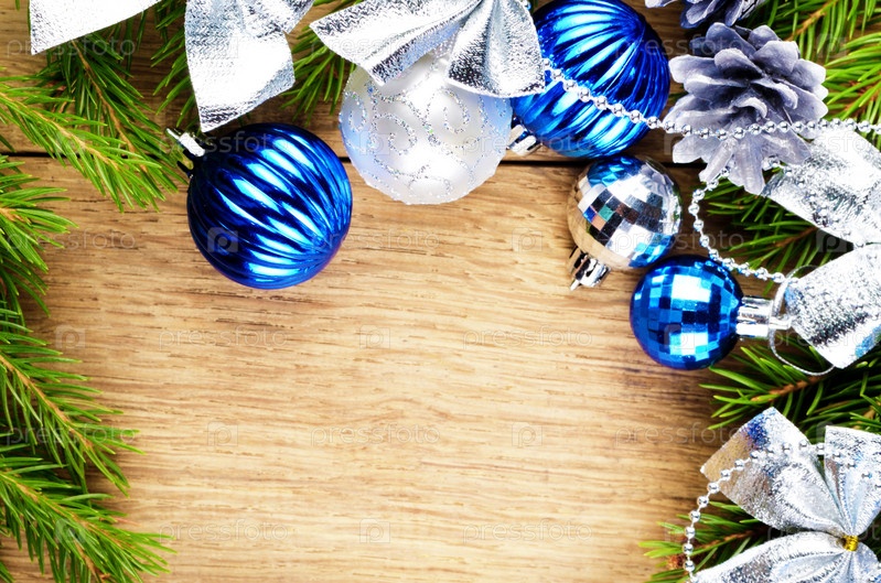 Новогодний фон синие и серебряные шарики на деревянном столе