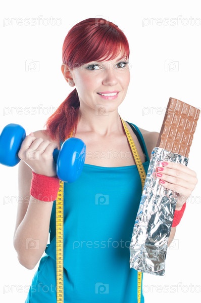 Улыбающаяся спортивная девушка с гантелей в одной руке и плиткой шоколада в другой, на белом фоне