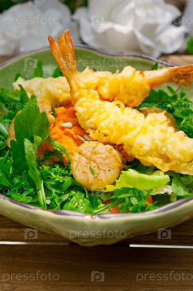 Свежие японские темпура креветки с салатом
