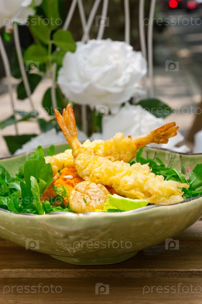 Свежие японские темпура креветки с салатом