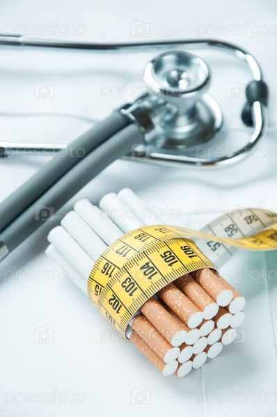 Сигареты, обвязанные сантиметровой лентой, и фонендоскоп на заднем плане