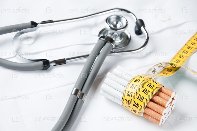 Сигареты, обвязанные сантиметровой лентой, и фонендоскоп на заднем плане