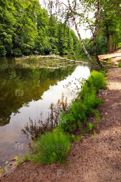 Зеленая трава на песчаном берегу реки