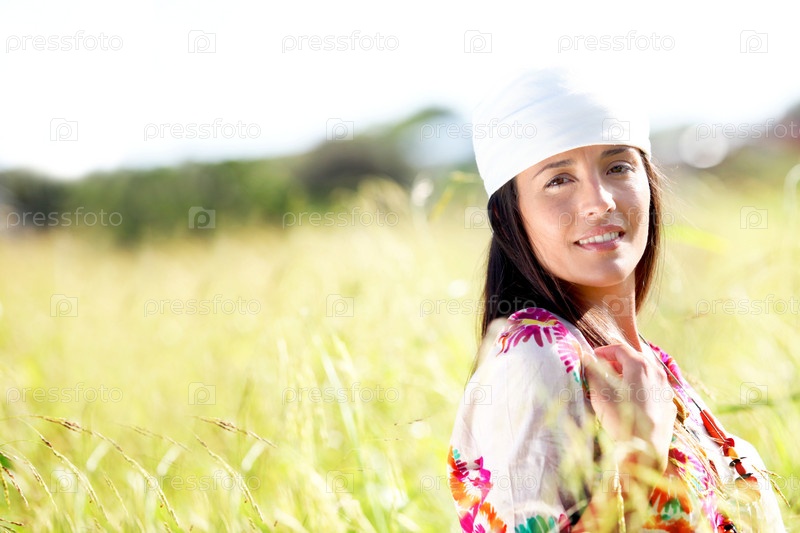 Красивая цыганка с шарф стоя в луг