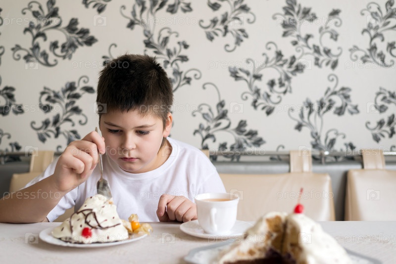 Мальчик завтракает тортом