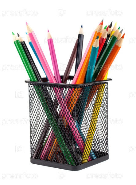 Различные цветные карандаши в черный металлический контейнер