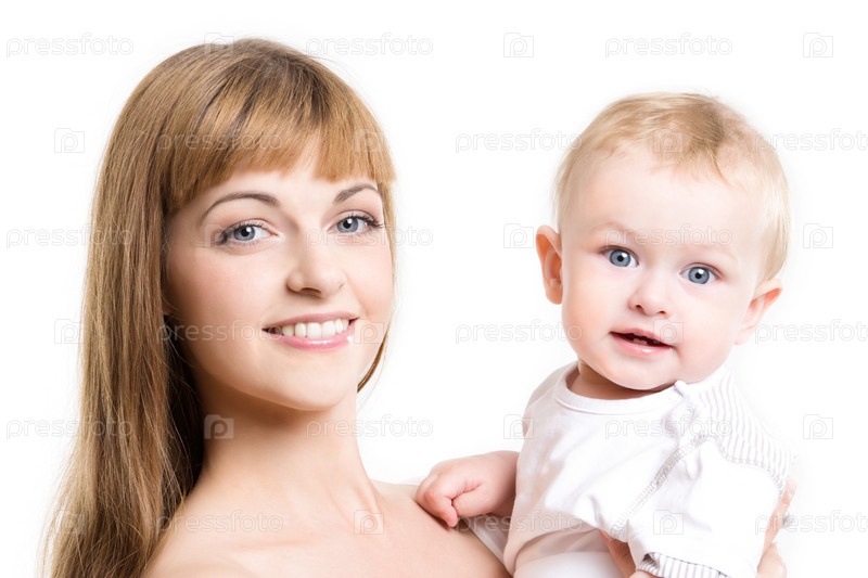 Крупным планом портрет молодой матери с сыном очаровательны, изолированные на белом