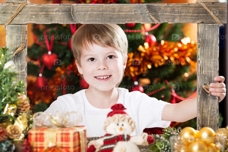 Счастливый мальчик смотрит в деревянной раме фоне украшенные рождественские