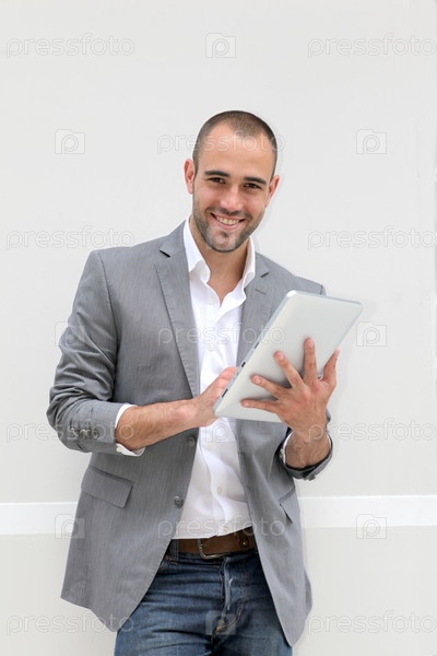 Прохладный бизнесмен, используя электронный планшет на белом фоне