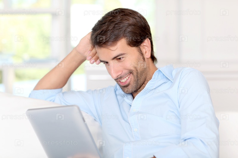 Красивый парень на дому с планшетом