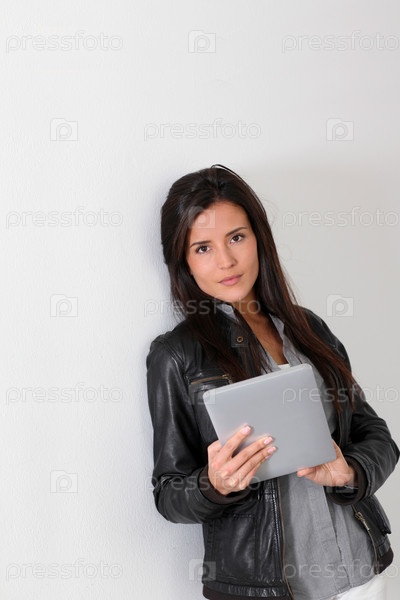 Модная девушка, прислоняясь к стене с планшетом
