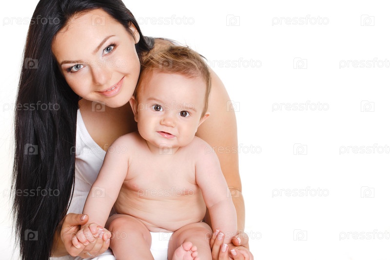 Молодая мама с малышом на белом фоне