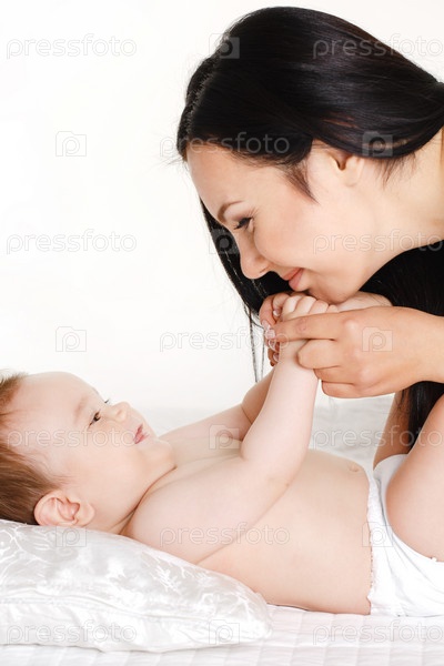 Молодая мама с малышом на белом фоне