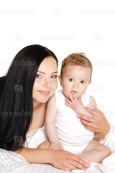 Молодая мама с малышом на белом фоне