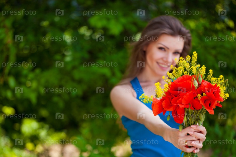 Эффектная брюнетка с букетом маков