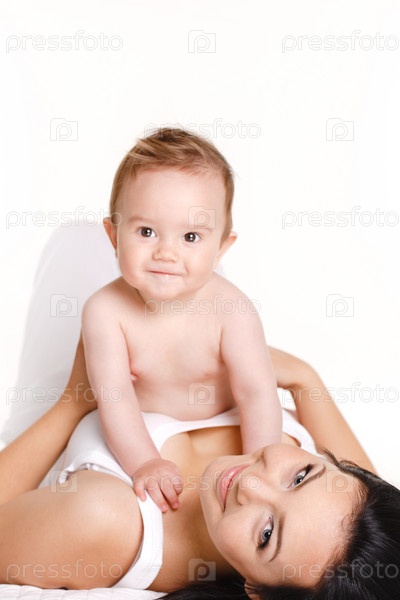 Молодая мама с малышом на белом фоне