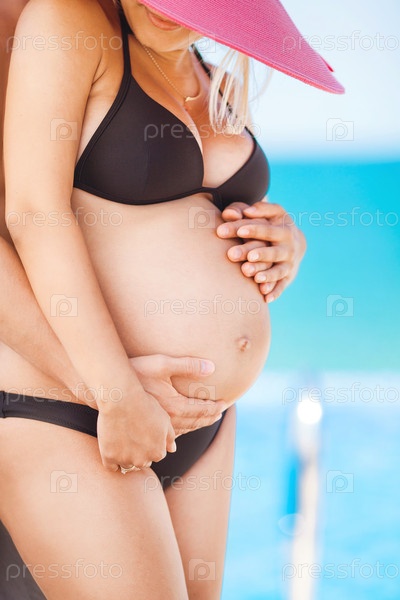 Беременная блондинка с любимым мужем на пляже