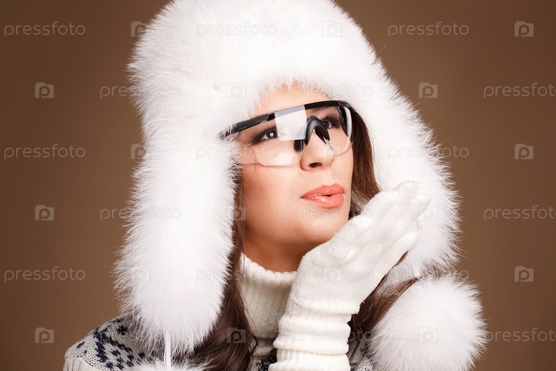 Брюнетка в меховой шапке и перчатках