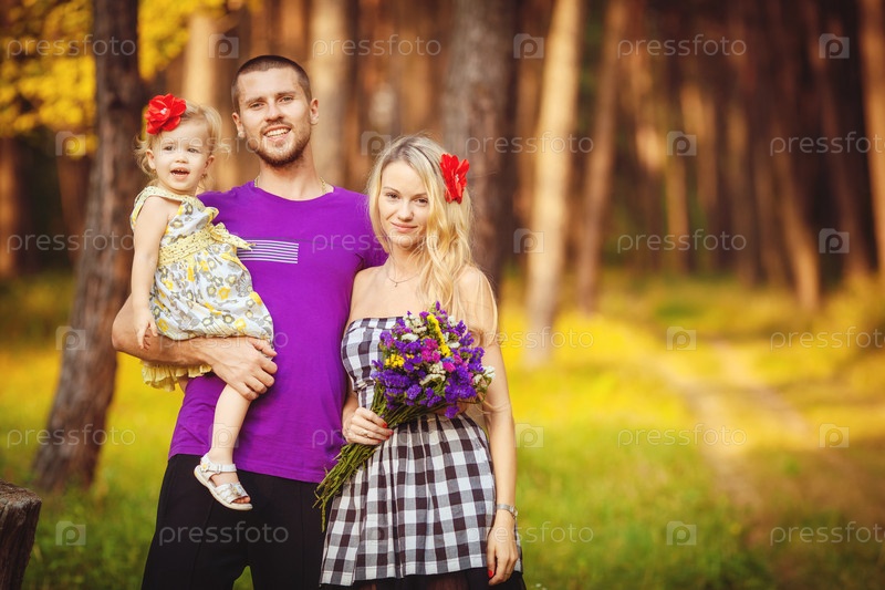 Молодая семья на прогулке в лесу
