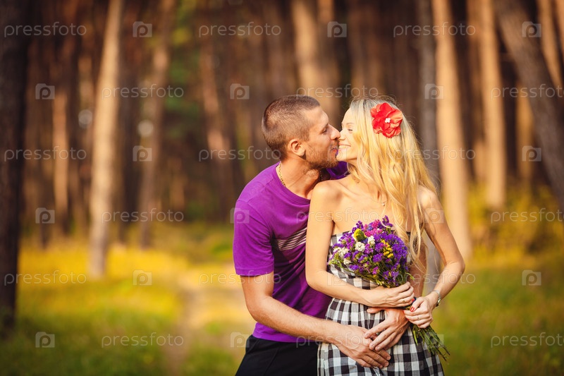 Влюбленная пара на прогулке в лесу