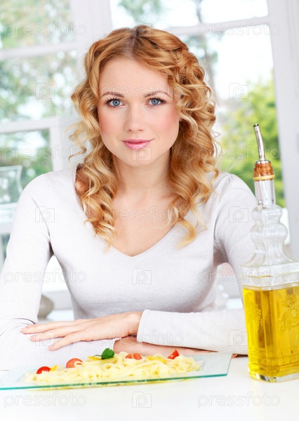 Портрет блондинка женщина, сидящая на блюдо макароны
