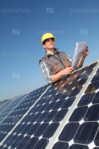 Человек стоял у солнечных панелей с планом строительства