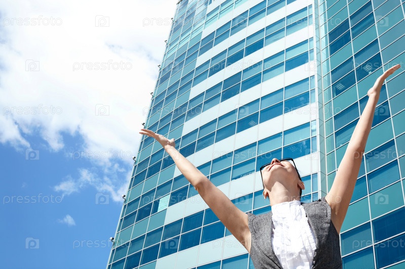 Счастливый молодая женщина с очки и современный офис небоскреб, сфокусироваться на лице