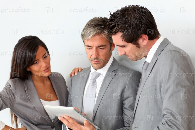Деловые люди, встреча в зале с планшета