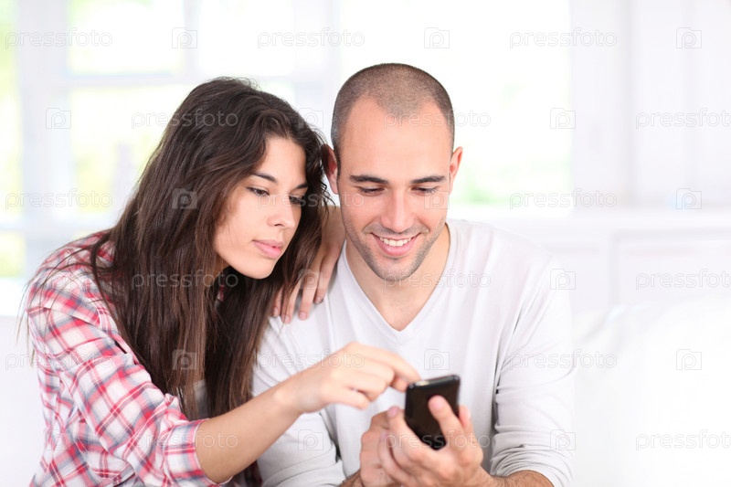 Молодая пара, делать онлайн магазинов с смартфон