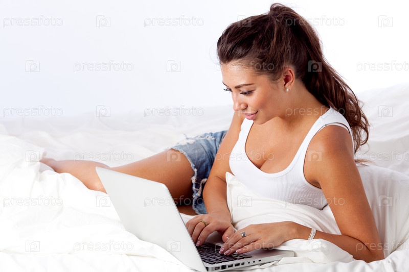 Молодая женщина в постели с ноутбуком