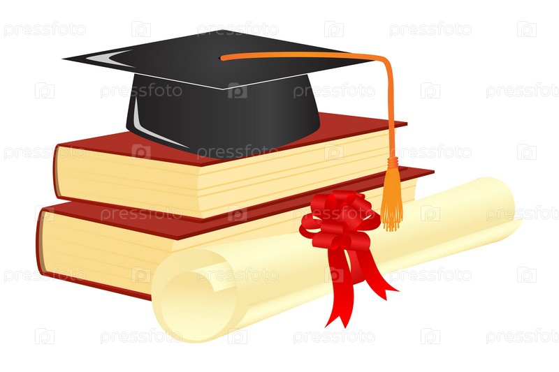 Академическая шапочка на стопке книг. Рядом сверток, обвязанный красной лентой. Изолированные на белом фоне. Векторные иллюстрации