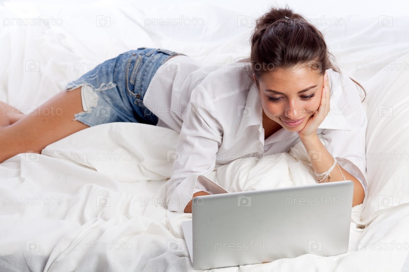 Девушка с ноутбуком на кровати